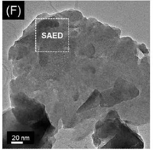 图F为一个典型的砂磨后的Ta-LLZO颗粒的STEM照片。经过砂磨的细颗粒表面较为粗糙,对其中白色虚线框标记的区域做选区电子衍射(SAED),结果如图G所示。电子衍射花样为展宽明显的多晶德拜环,最亮的环对应于晶面间距为0.31nm的(240)面。该面间距比纯Ta-LLZO粉体和H+交换后的Ta-LLZO晶格中的数值大。说明砂磨后的细Ta-LLZO颗粒表面和内部晶格变形并多晶化。图H为颗粒表面的HRTEM原子排列图像。该图像表明,Ta-LLZO在极小的畴区内(1~2nm)有序排列,但不同畴区的排列完全是无序的,进一步证实了砂磨颗粒的多晶化,利于后续烧结。